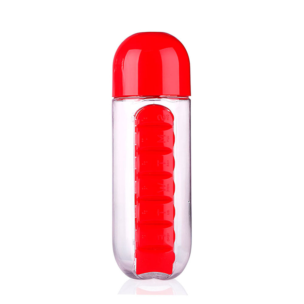 Práctico organizador de pastillas con una botella de agua, contiene 7 compartimentos pequeños en la botella para llevar tus pastillas si es necesario, la combinación perfecta de contenedor de píldoras con un vaso para llevar el agua, adecuado para gimnasio, deporte, viajes, senderismo, etc. Práctico organizador diario fabricado con un organizador de píldoras integrado, tendrás tus píldoras, el agua e incluso la tapa como una taza en todo momento. Ideal para viajar.