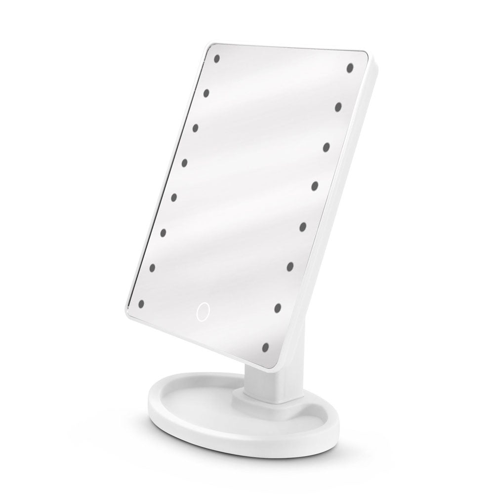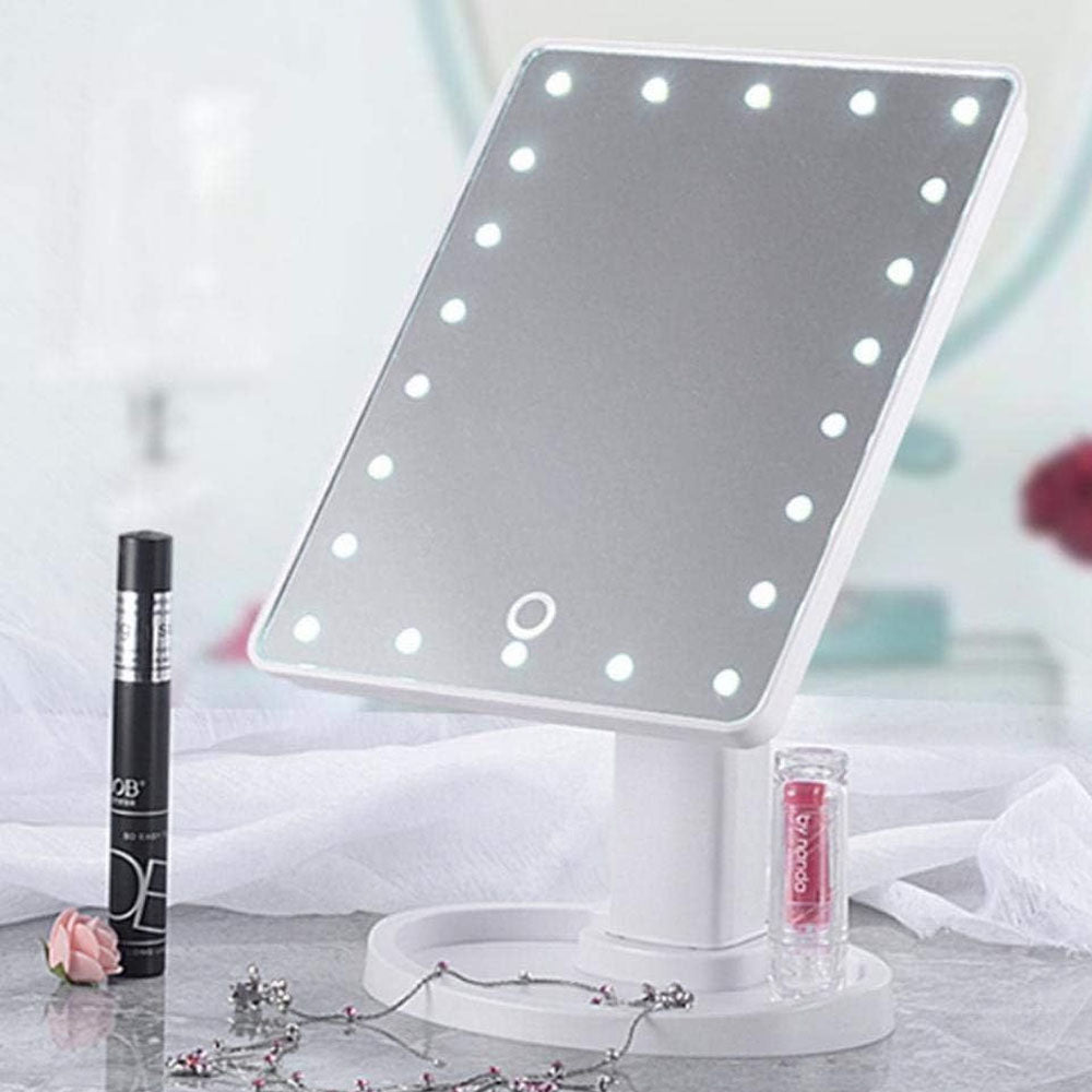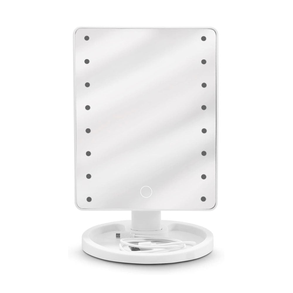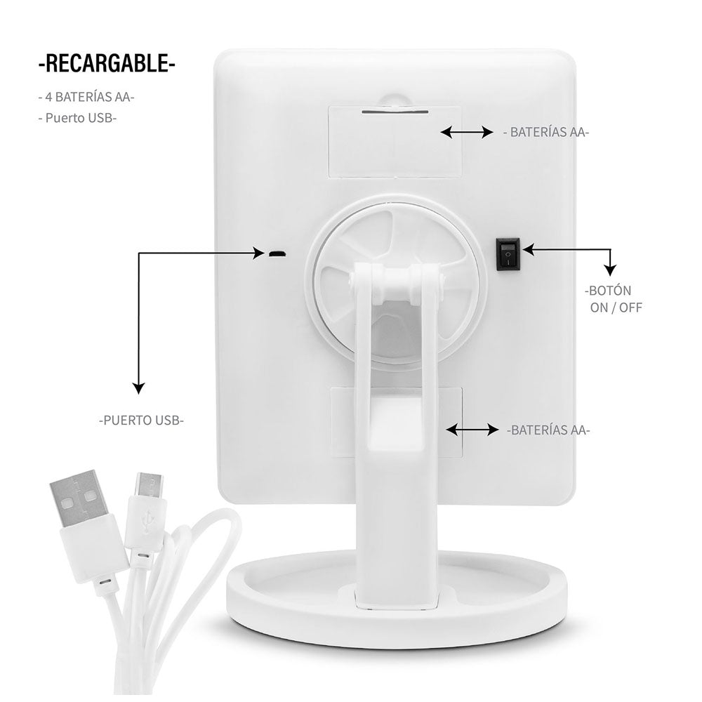 Este espejo es perfecto para maquillistas y amantes de la belleza, ya que cuenta con luz natural modificable en intensidad de alta calidad. La rotación libre de 180 grados se puede utilizar en cualquier posición y equilibrar la iluminación de la vista. Con luces LED blancas que iluminan tu piel y colorean de manera clara y correcta. Práctico botón de encendido y apagado y pantalla táctil. Enciende y apaga las luces LED presionando el botón circular en el espejo. También hay un interruptor de encendido y apagado, ubicado en la parte posterior del espejo. Con controles táctiles, 22 luces LED brillantes que cubren el espejo y rotación giratoria este hermoso espejo de cambiador captará cada ángulo. Recargable USB